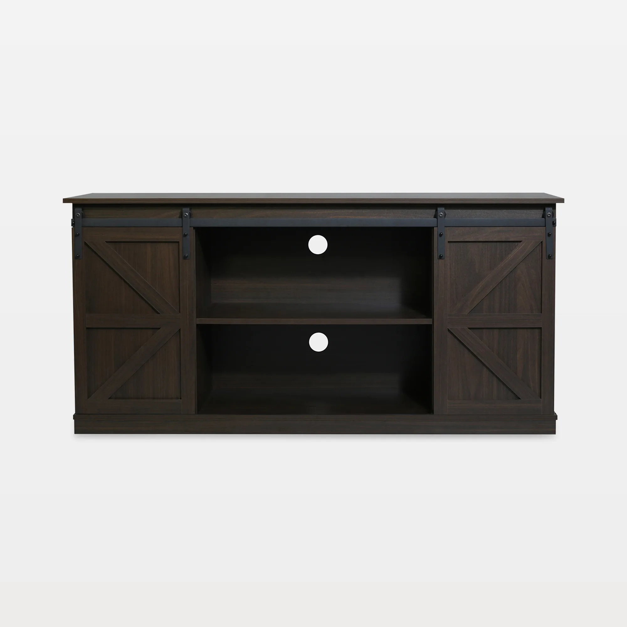 - Barn-style doors glide along metal rail hardware for easy access to center shelves as well as side storage cabinets for storing gaming systems, cable boxes, and other AV components.