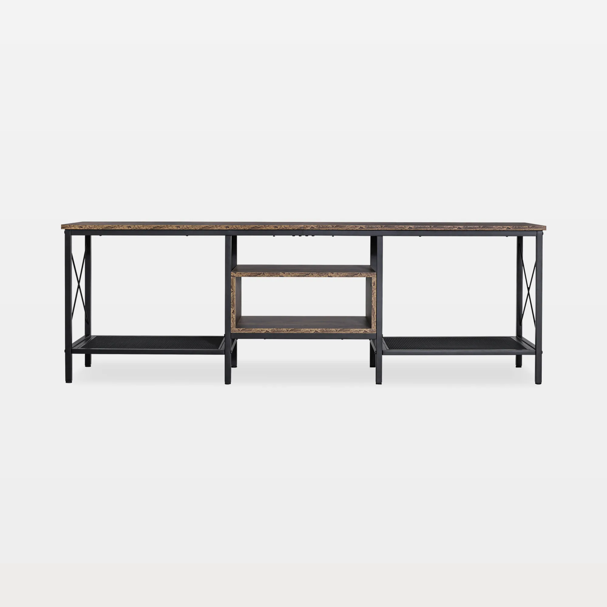 Organize your media items in the living space with this industrial-inspired TV stand. The rectangular frame is made of engineered wood and steel, and it showcases a two-tone finish of your choice. We love that it has two open shelves to store game consoles, DVD collections, audio, and other TV components., while an open shelf is ideal for displaying your items,too. The X-shape inspired design and manufacture wood,black part complete the look in any industrial space.Plus, it has a spacious surface that accommodates flat screen up to 70″.