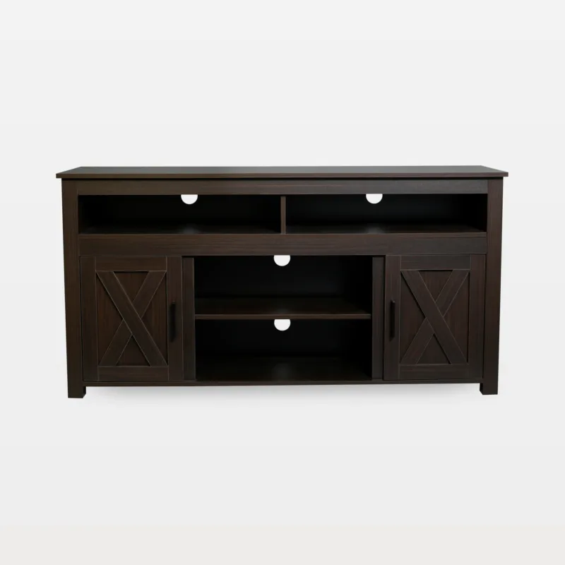 Sliding barn doors keep the look warm and tidy. A barn door TV stand offers closed storage for clutter, plus center bays for a soundbar. It is a practical TV stand with storage that reads cozy rather than bulky.