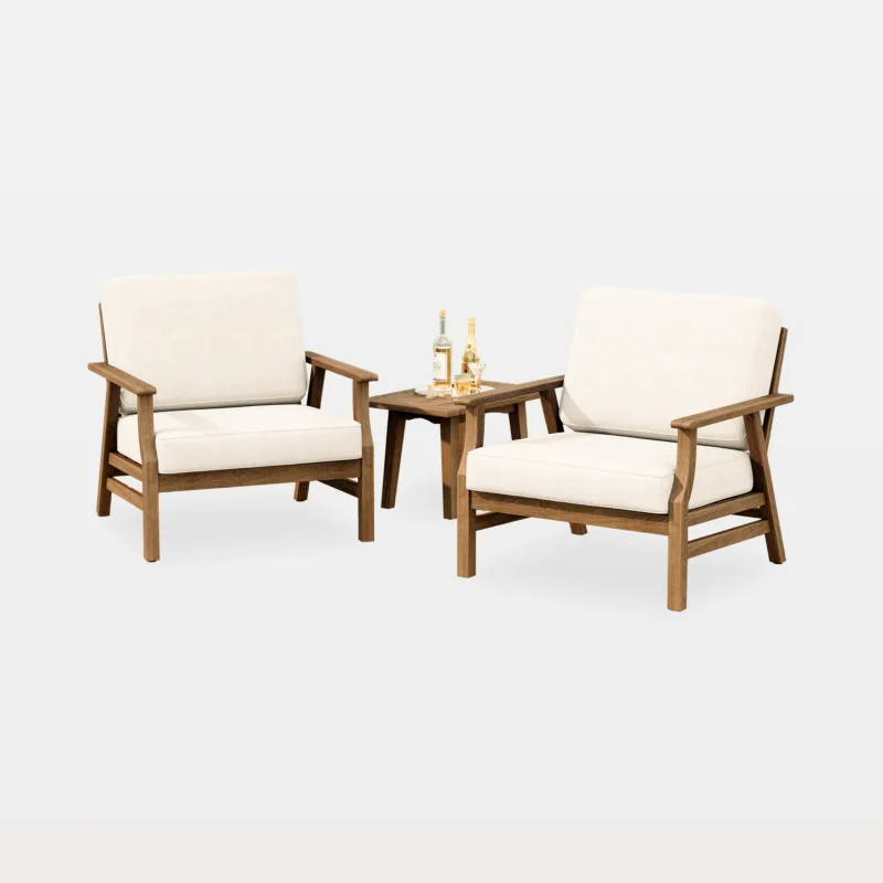 Minimal by design, big on comfort. A padded fabric loveseat and two armless chairs gather around a teak table; all-teak frames withstand the elements and keep comfort strong.