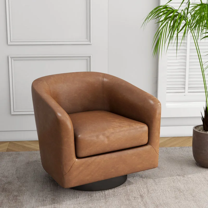Start in mid-century mode, swivel into the now. Our Cavian swivel chair turns smoothly when the room shifts, from talk to TV to reaching your side table. The barrel back feels gently held-in, while foam padding and your upholstery choice keep things inviting.