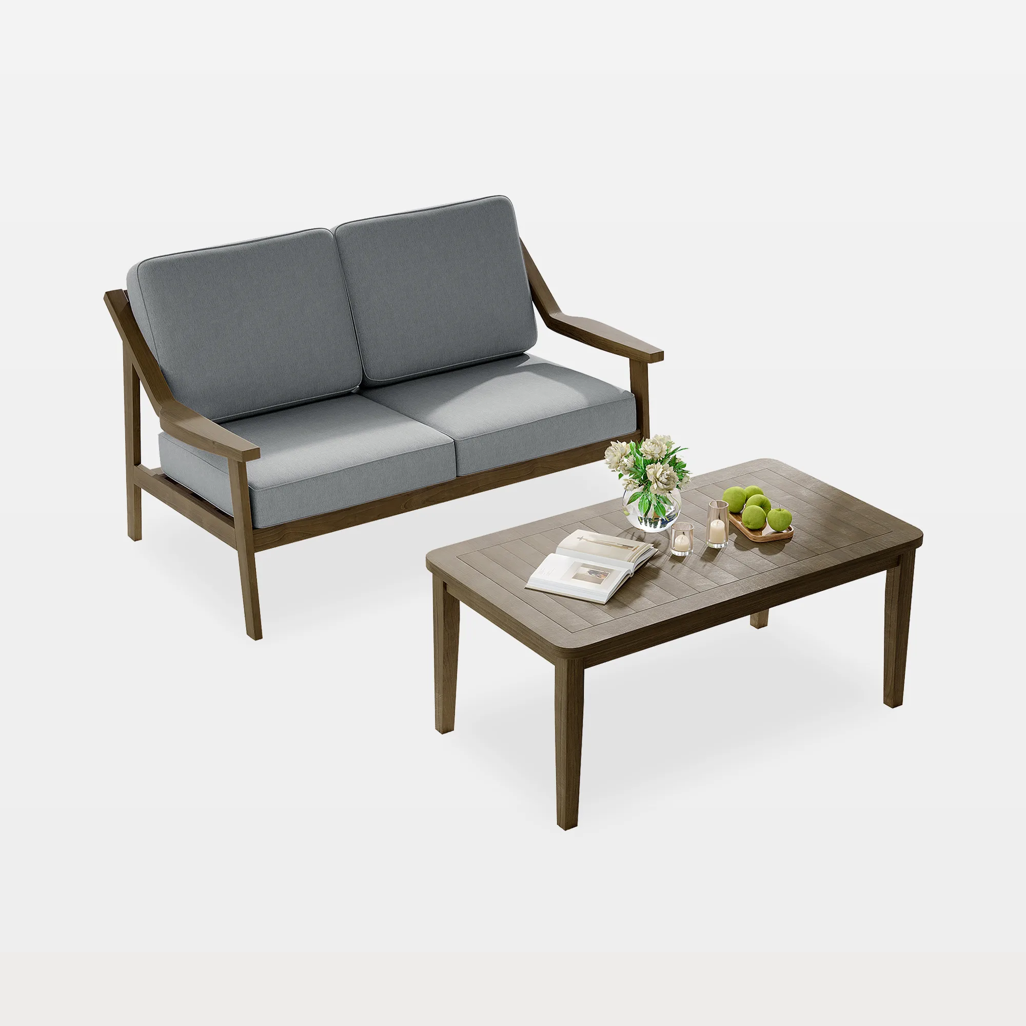 - Includes a teak loveseat and coffee table, shaping a relaxed patio seating spot for two.