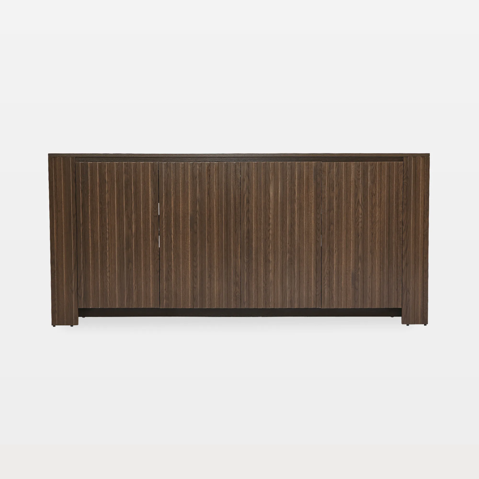 - Handle-free doors keep the fluted front looking clean, calm, and visually uninterrupted.