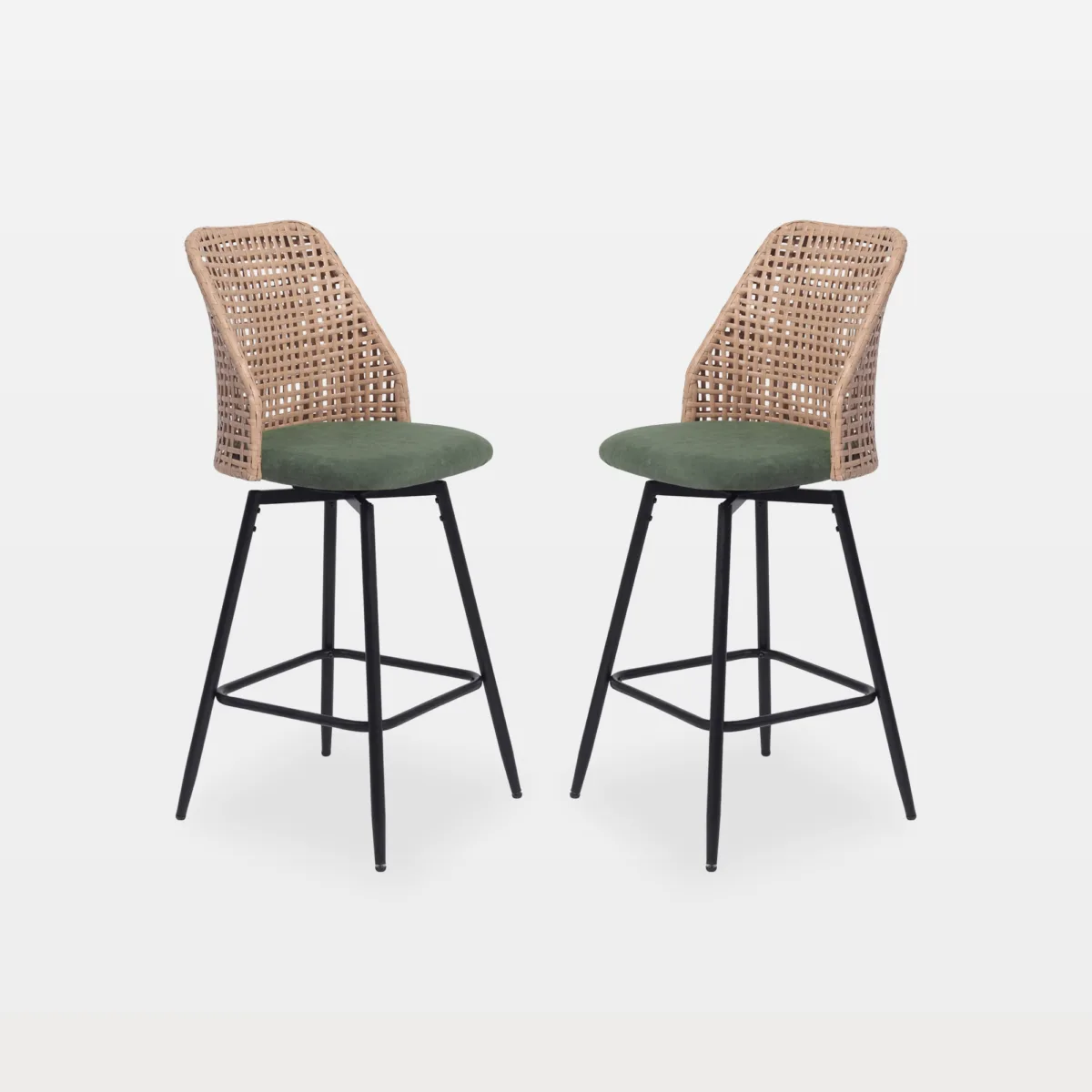 Turn casual nights into coastal bar time with our Olivay Wicker Swivel Upholstered Bar Stools Set of 2. The mid-height backs feature a wicker-style weaving technique that brings relaxed, beach-inspired texture without feeling heavy. Chenille seats with foam cushioning keep each perch soft and supportive at 28.7 inches high. A smooth 360-degree swivel lets you turn toward the cook, the conversation, or the TV in one easy move. Slim metal legs, a square footrest, and adjustable levelers help both stools sit steady and comfortable.