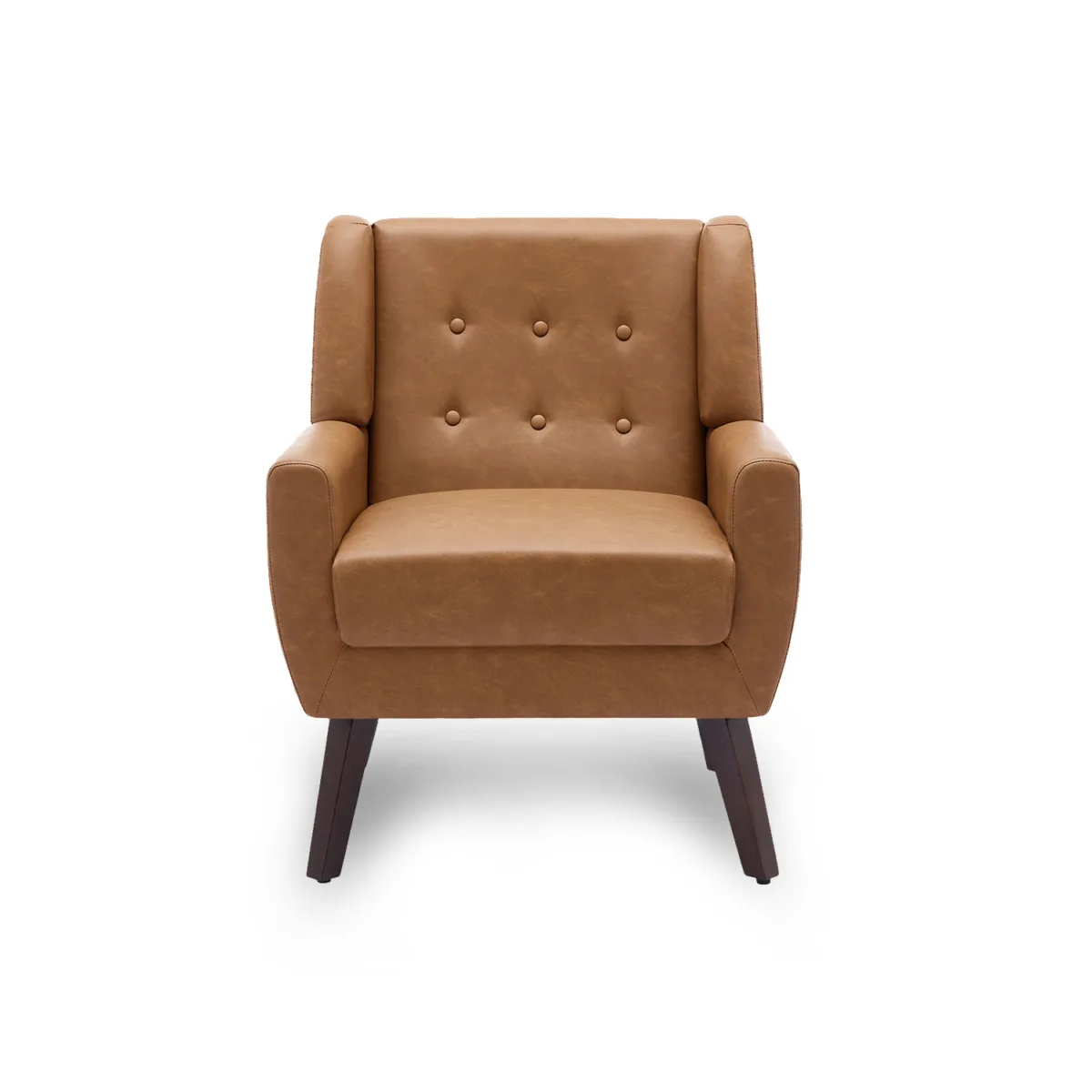 This accent chair is stunning fusion of classic design and modern sophistication. Featuring a timeless backrest silhouette adorned with a stylish tufted detail, this chair embodies a minimalist contemporary aesthetic. Constructed from a solid wood frame and engineered wood, it boasts rectangular legs finished in a warm, deep walnut veneer, seamlessly merging vintage charm with modern elegance. The removable and washable cushion offers practical convenience, while the premium leather upholstery provides a soft, water-resistant surface available in a range of colors to suit any décor. High-density foam and resilient springs ensure optimal support for comfortable reading or relaxation. The square armrests and tall backrest further enhance the chair’s distinctive design, making it a standout addition to any space.