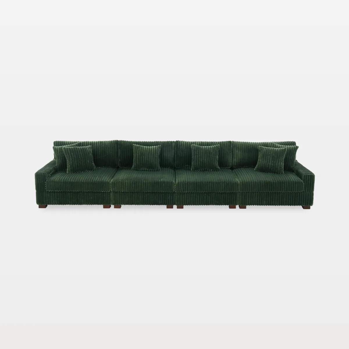 Kick back low and stay awhile with our Phydra 4-Seat Low Profile Upholstered Sectional Sofa. Two corner seats and two armless modules stretch out into a wide, relaxed run for movie nights, snack breaks, and friends dropping in. The low profile keeps sightlines open, so the room still feels airy even when everyone piles on. Sink into the cushioned seats, then settle against the back for an easy, supported lounge that does not feel stiff. Soft-touch upholstery adds touchable texture and a clean, modern rhythm across the silhouette. Keep it simple, or bring in one or two matching ottomans for feet-up comfort, extra seating, or a tray moment.