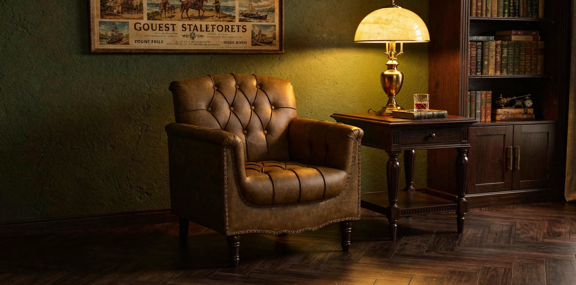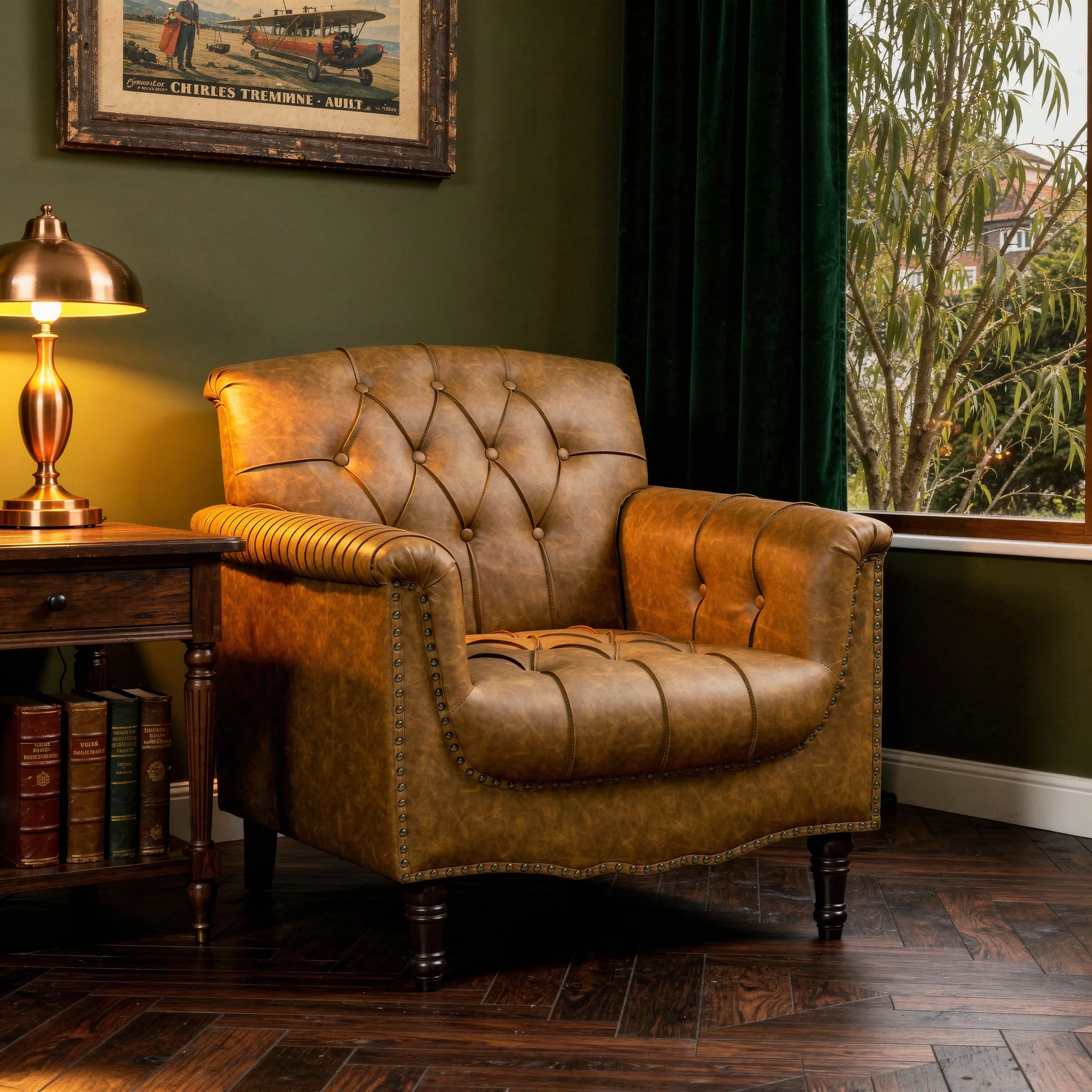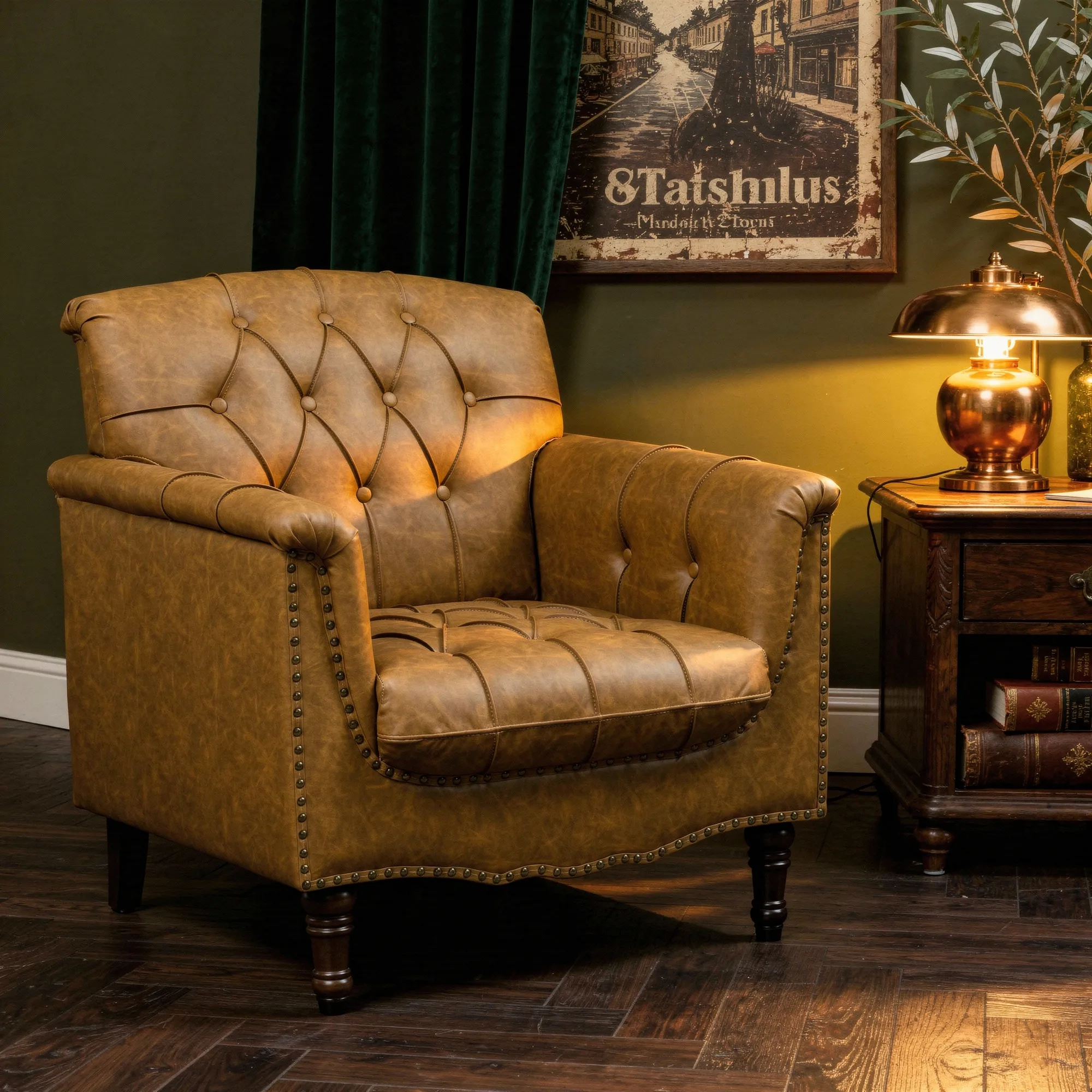 Dressed like an old-school gentleman, our chesterfield style armchair is made to hold the room. Deep diamond button tufting pulls the faux leather into a classic grid, the kind you picture in a 19th-century London club or an old Southern study. Its nailhead trim traces the outer arm panels and base edge with a polished bite, and turned front legs finish the look with traditional weight.