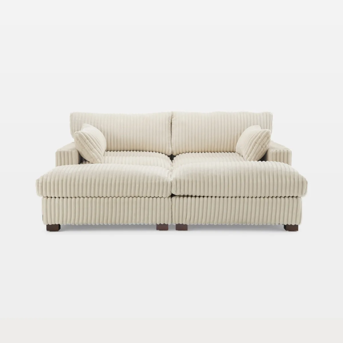 Let the hours stretch, the snacks linger, and the remote stay put. Our channel tufted modular double chaise sofa is built for full-length lounging, with deep seating that invites you to sprawl, curl up, or half-recline. The horizontal channels create that low, wide presence, and the corduroy texture adds a warm, tactile feel. Joined together, the front reads smooth and continuous, giving your legs and blankets room to relax comfortably.